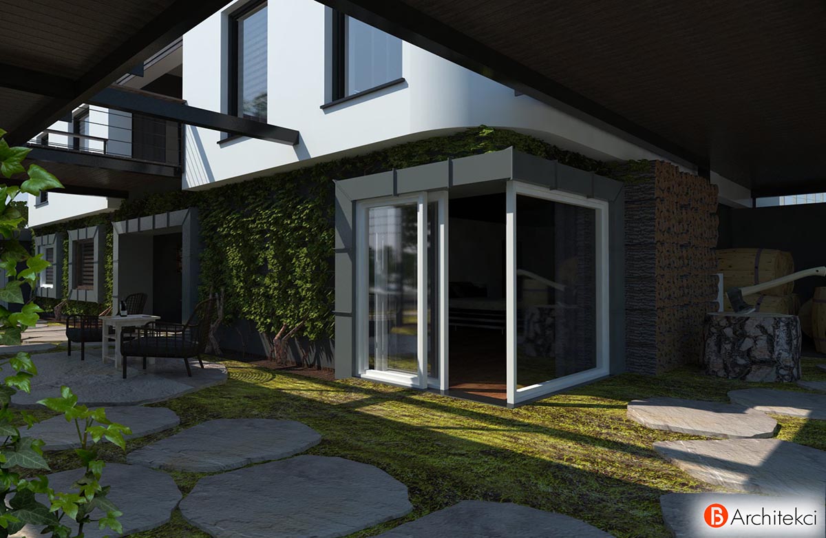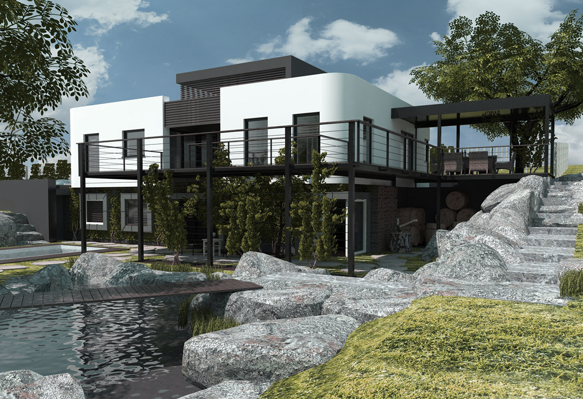 Budynek mieszkalny, jednorodzinny zaprojektowany został na południowym stoku. Teren działki ze spadkiem umożliwił zabudowę tarasową. Budynek o bryle parterowej od strony głównego dojazdu, otwiera się na stronę południową kolejną kondygnacją w poziomie przyziemia. Aranżacja i wypłaszczenie zaprojektowane od strony "podwórka" ma charakter rekreacyjny z namiastką gospodarstwa umożliwiającego produkcję wina na własne potrzeby. Od strony zachodniej w teren wkomponowano piwniczkę na wino, dostępną z podwórka.