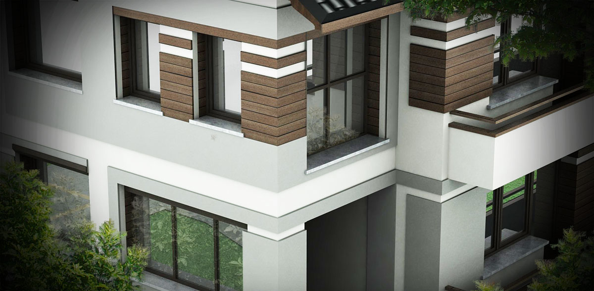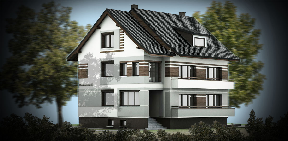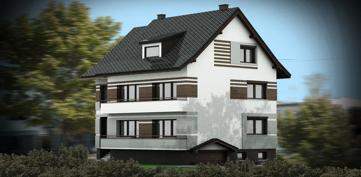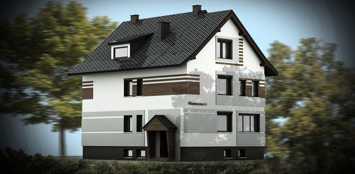 Przedstawiamy przykład projektu wykończenia i kolorystyki elewacji budynku mieszkalnego. W skład opracowania wchodzi wykonanie obmiaru elewacji, zbudowanie trójwymiarowego modelu, wykonanie koncepcji w kilku wariantach i przedstawienie jej w formie wizualizacji. Po akceptacji przez inwestora wykonujemy projekt szczegółowy z wymiarami, zestawieniem wykorzystanych materiałów.