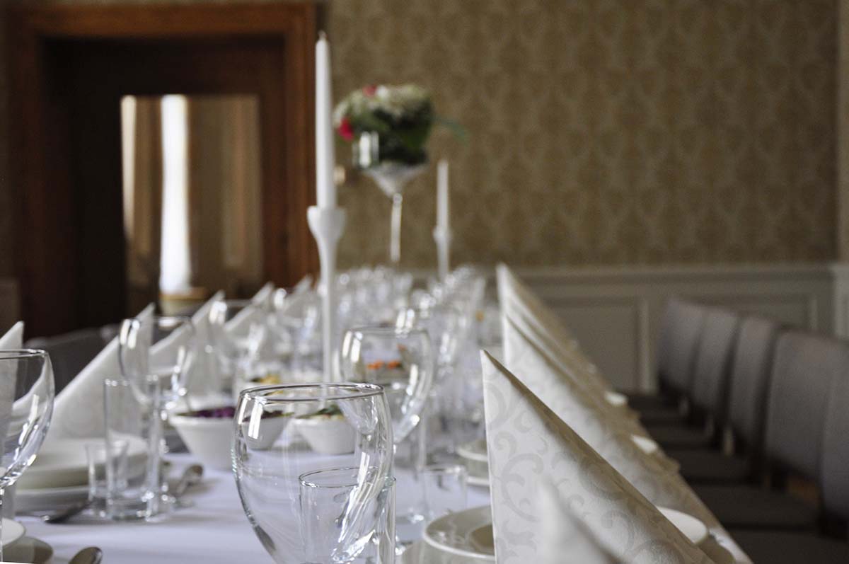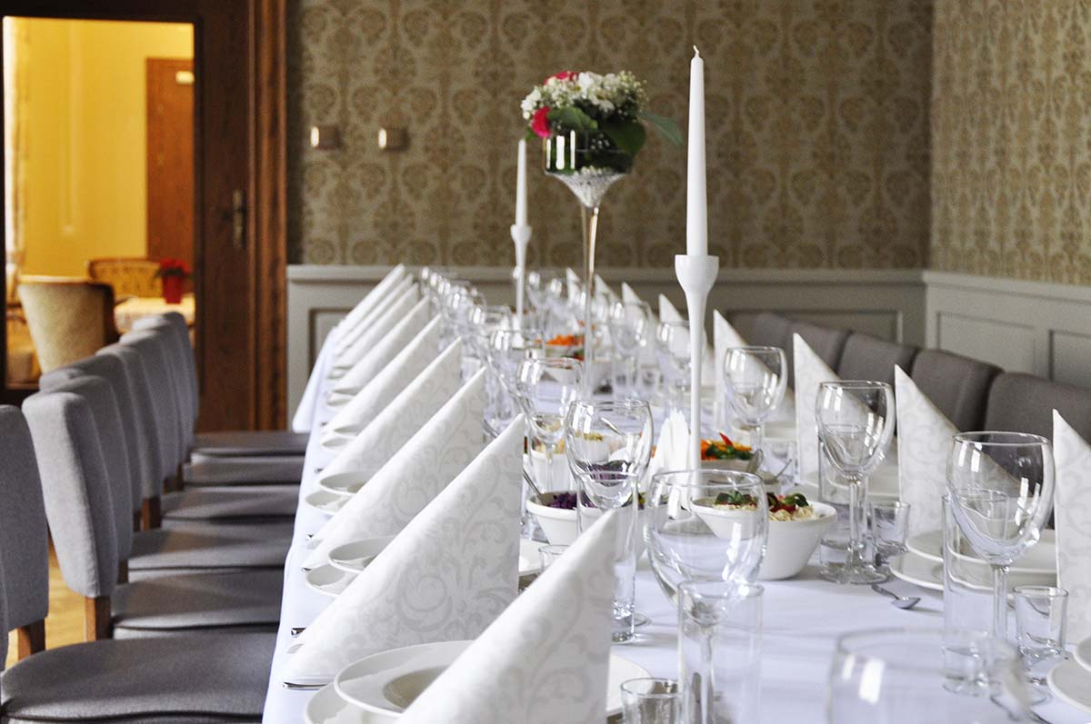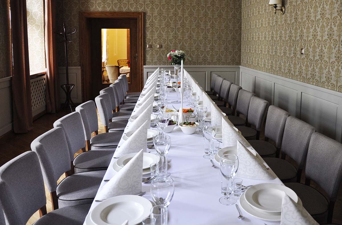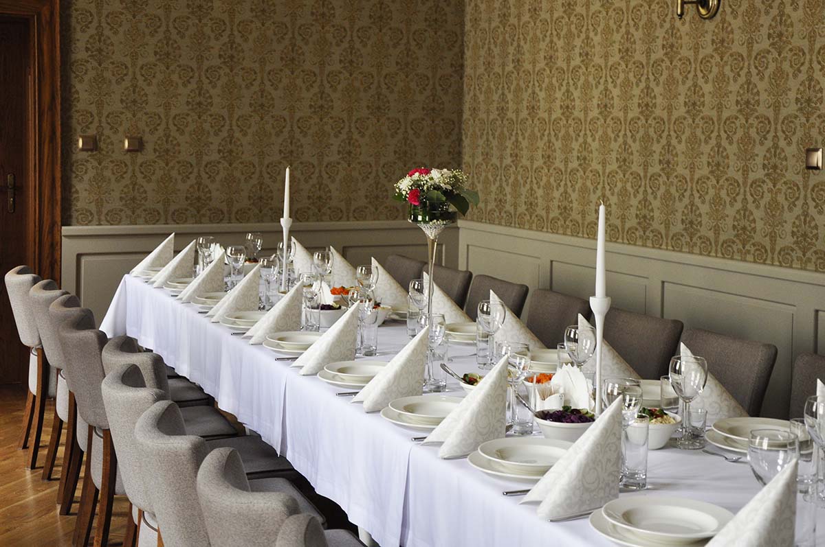 Prezentujemy salę bankietową na około 25 osób. Ściany wykończone wzorzystą tapetą, zwieńczone zabytkowym gzymsem. Opaskowo wykonany cokół w formie stylizowanej drewnianej boazerii. Posadzka wykończona drewnianym parkietem. Całość tworzy przestrzeń spójną o charakterze stonowanym. Poniżej prezentujemy układ pomieszczenia. Zapraszamy do oglądnięcia galerii powyżej.