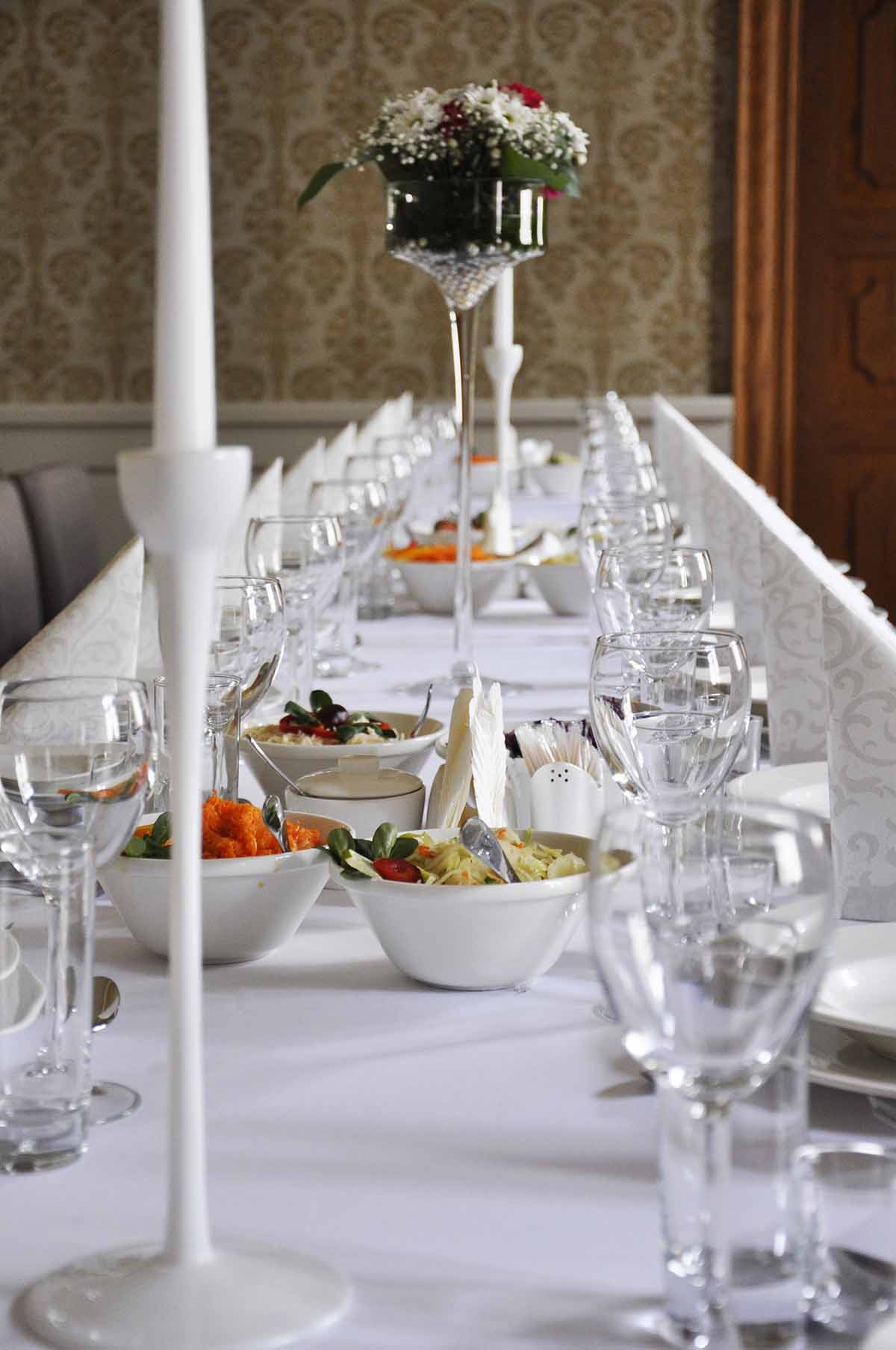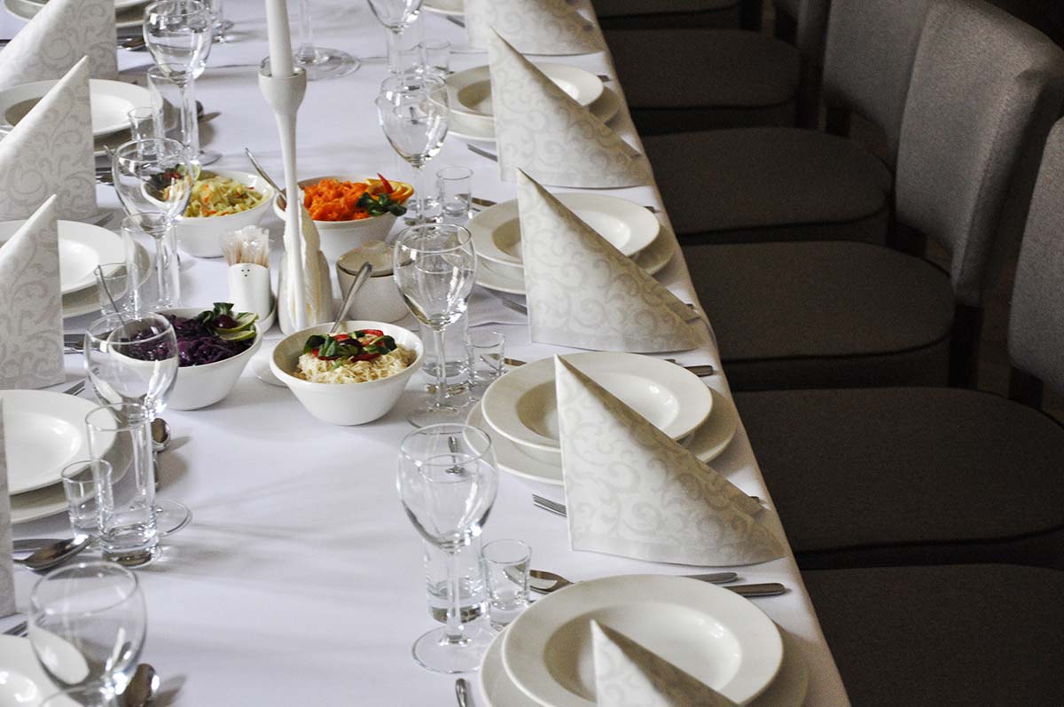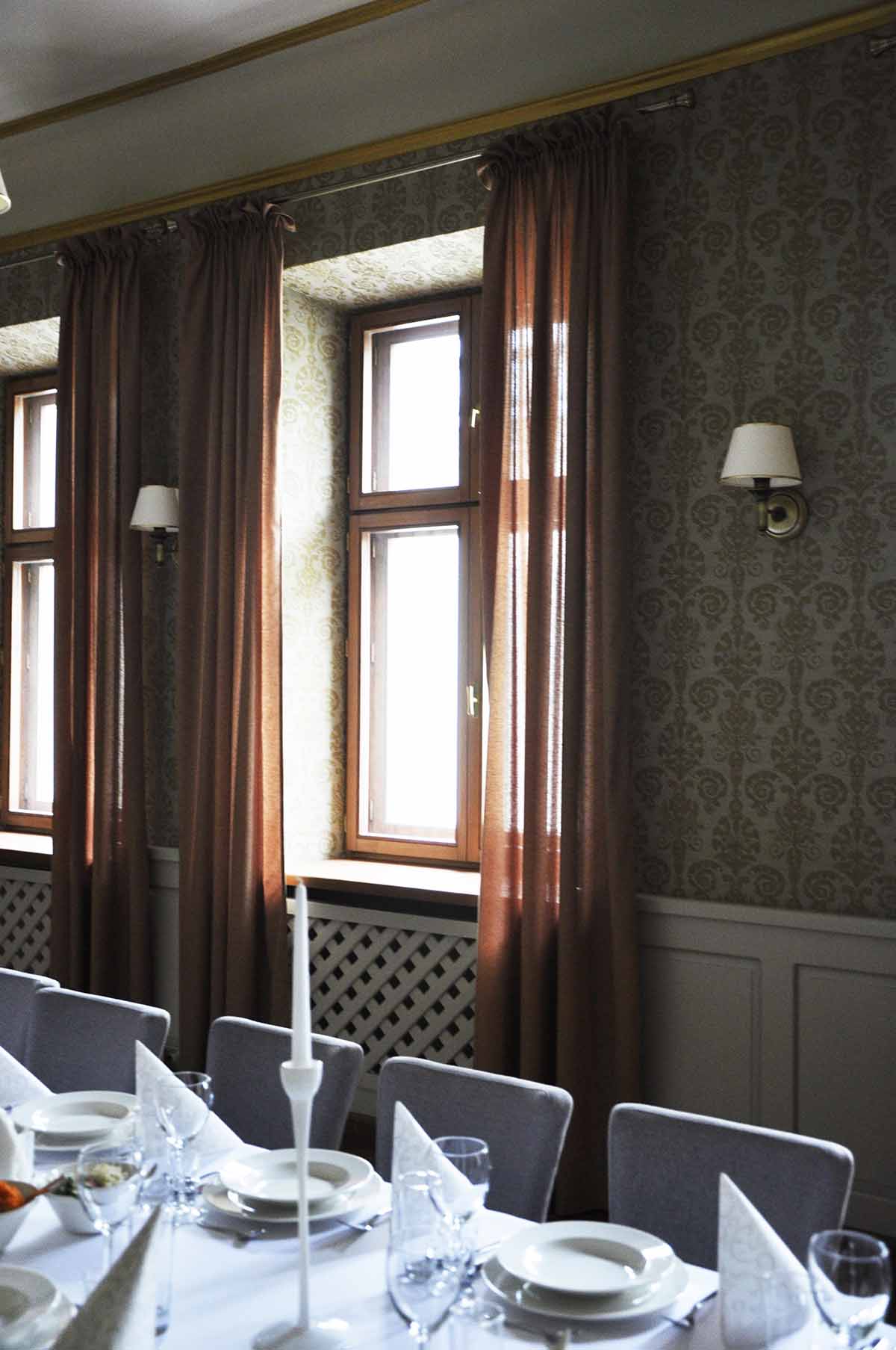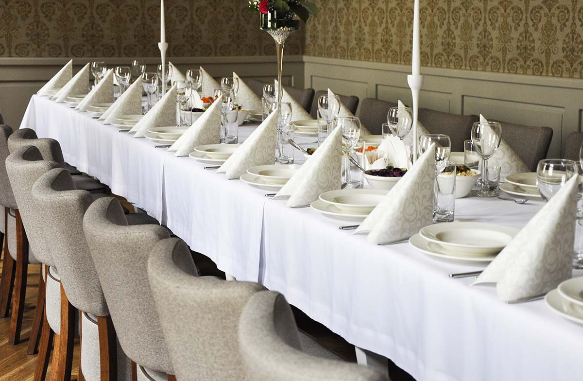 Prezentujemy salę bankietową na około 25 osób. Ściany wykończone wzorzystą tapetą, zwieńczone zabytkowym gzymsem. Opaskowo wykonany cokół w formie stylizowanej drewnianej boazerii. Posadzka wykończona drewnianym parkietem. Całość tworzy przestrzeń spójną o charakterze stonowanym. Poniżej prezentujemy układ pomieszczenia. Zapraszamy do oglądnięcia galerii powyżej.