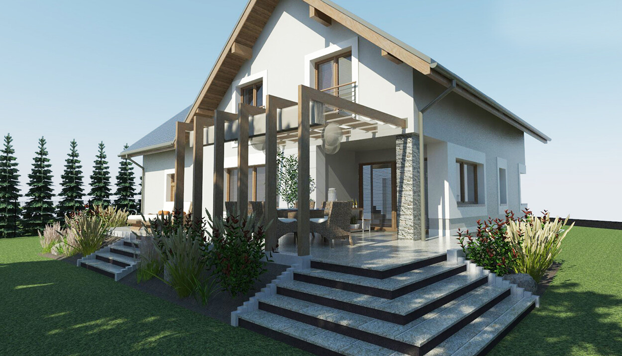 Budynek mieszkalny, jednorodzinny. Nasza praca polegała na zaprojektowaniu wykończenia elewacji oraz kompleksowym opracowaniu wystroju wnętrza. Sam projekt budowlany został opracowany przez zaprzyjaźnione biuro, naszą pracę zakontraktowano na dopracowanie strony wizualnej całości.