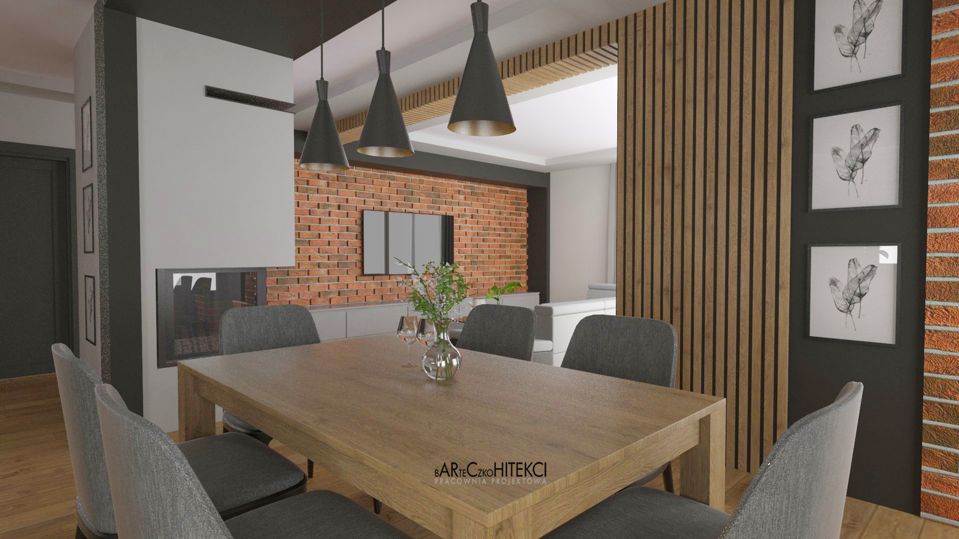 Wnętrza domu jednorodzinnego - kompleksowy projekt wnętrz obejmujący salon z kuchnią i jadalnią, hol wewnętrzny, hol wejściowy, 3 łazienki oraz sypialnię.