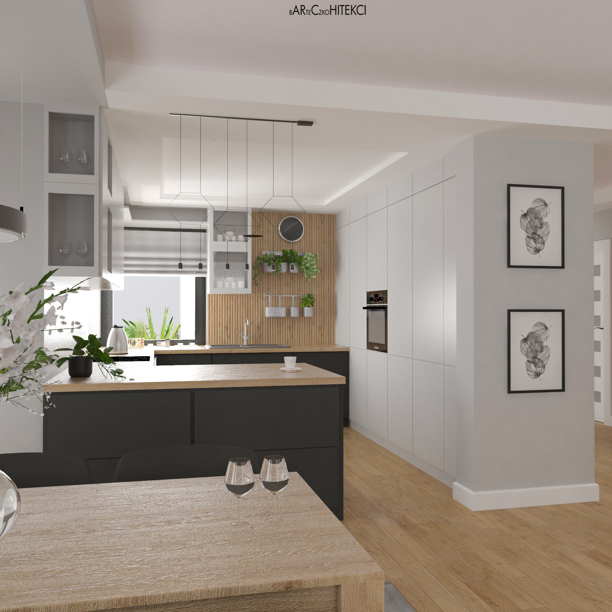 Projekt wnętrz mieszkania w Gliwicach obejmujący salon, jadalnię i kuchnię.