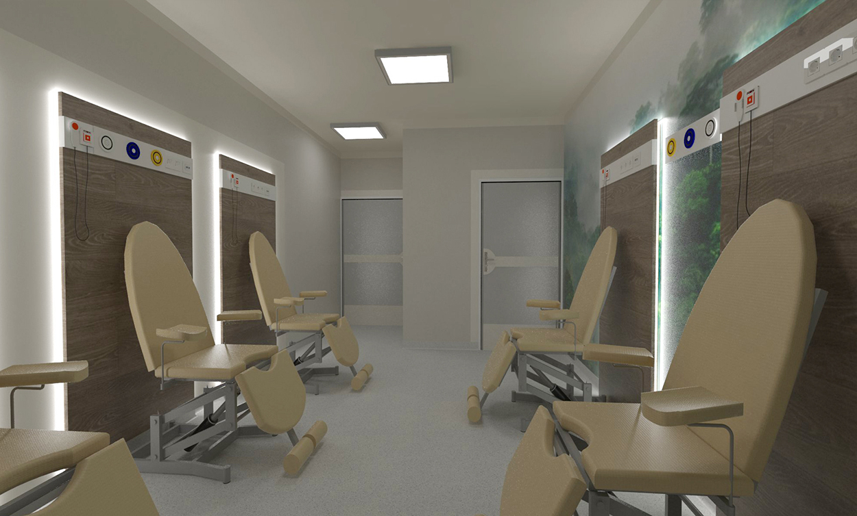 Projekt wnętrz sali fotelowej, pełniącej funkcji sali pooperacyjnej dla pacjentów oddziału okulistyki w Opolu.
