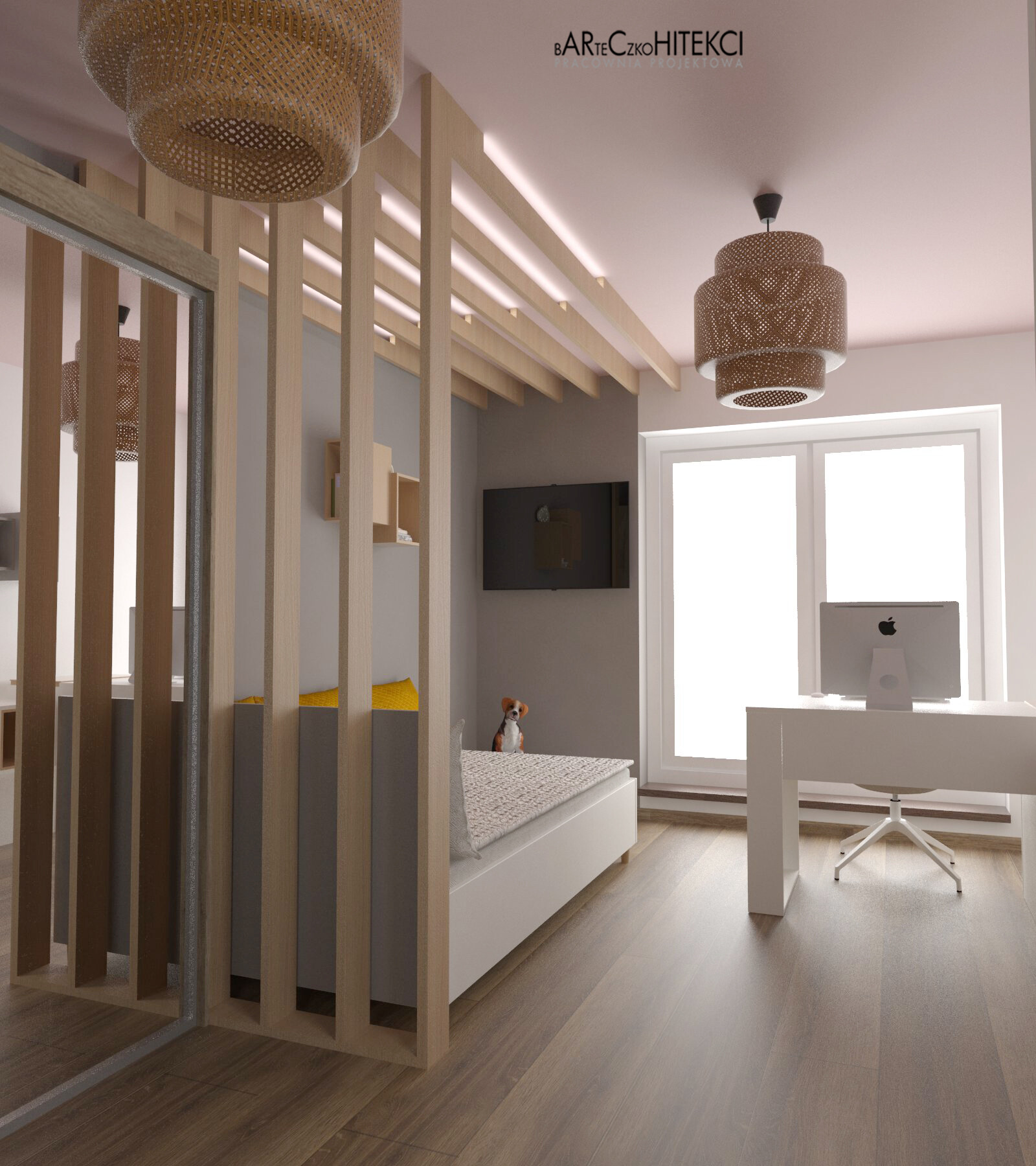 Projekt wnętrza pokoju młodzieżowego w budynku mieszkalnym.