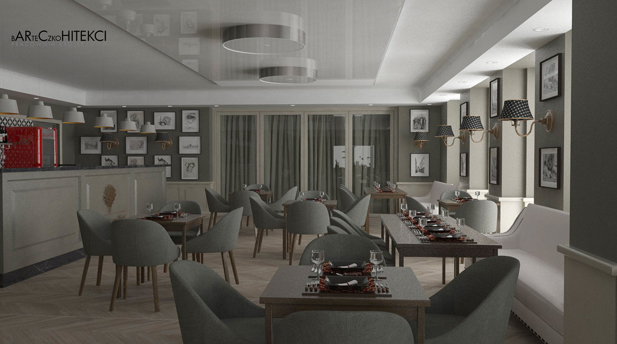 Przedstawiamy projekt wnętrz restauracji Pod Platanem przedstawiający wygląd głównej sali restauracji, z barem głównym.