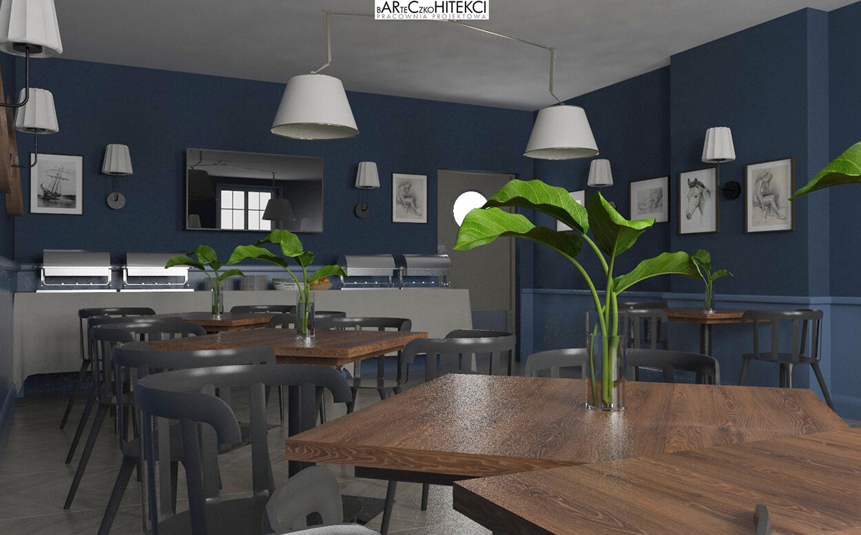 Przedstawiamy widoki z projektu sali śniadaniowej w restauracji Pod Platanem, która przeznaczona jest głównie dla gości hotelowych.