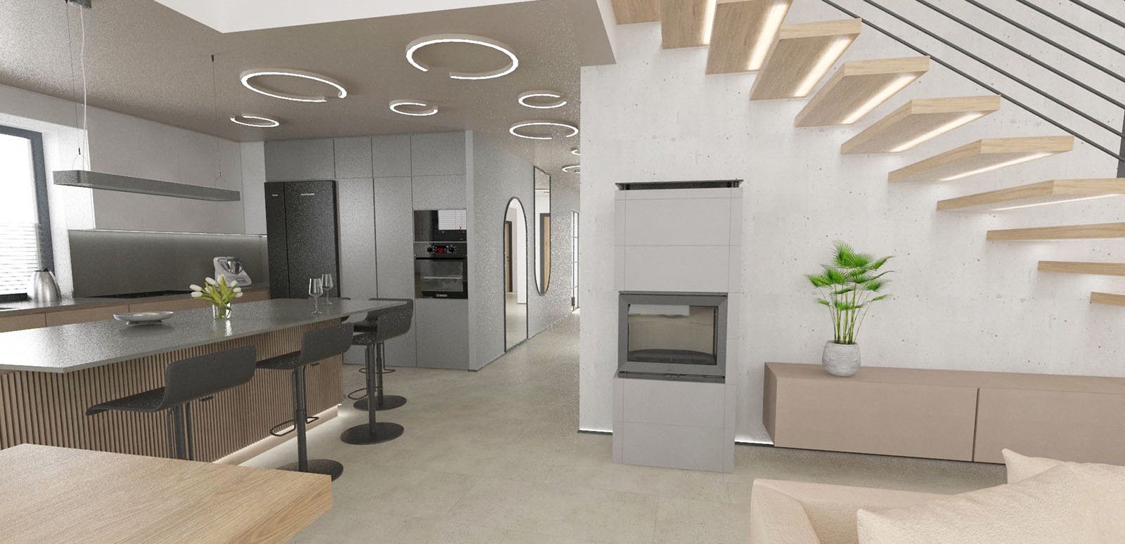 Projekt obejmował aranżację i wykończenie salonu wraz z otwartą kuchnią i częścią jadalnianą. Salon jednoprzestrzenny z otwarciem do dachu z dostępem na antresolę. Eleganckie i minimalistyczne schody wspornikowe wkomponowane w przestrzeń salonu. Projekt obejmował również aranżację i wystrój holu głównego, wiatrołapu oraz dwie łazienki. Zapraszam do oglądnięcia projektu domu którego wnętrza dotyczą - Dom -Cieszyn.ML.